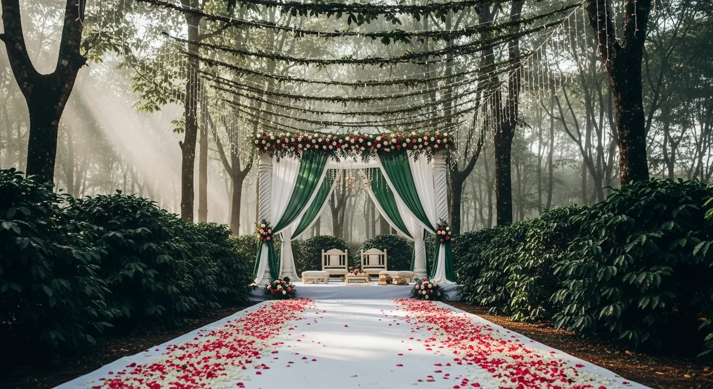 Plan a coffee plantation wedding in Coorg — mandap setup in coffee groves, natural decor ideas, lighting, sound, pest management, and rain backup for ₹15–35 lakhs.