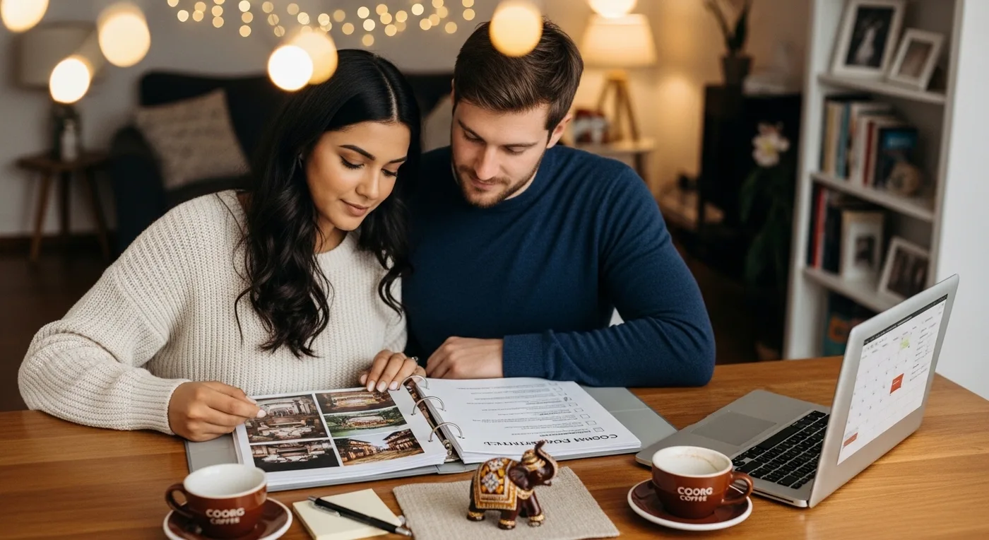 If you have not already done your pre-wedding shoot during your venue visit, schedule it now. Our guide covers the 15 best locations, from Abbey Falls to coffee estates. October through February offers the best light and mist conditions.
