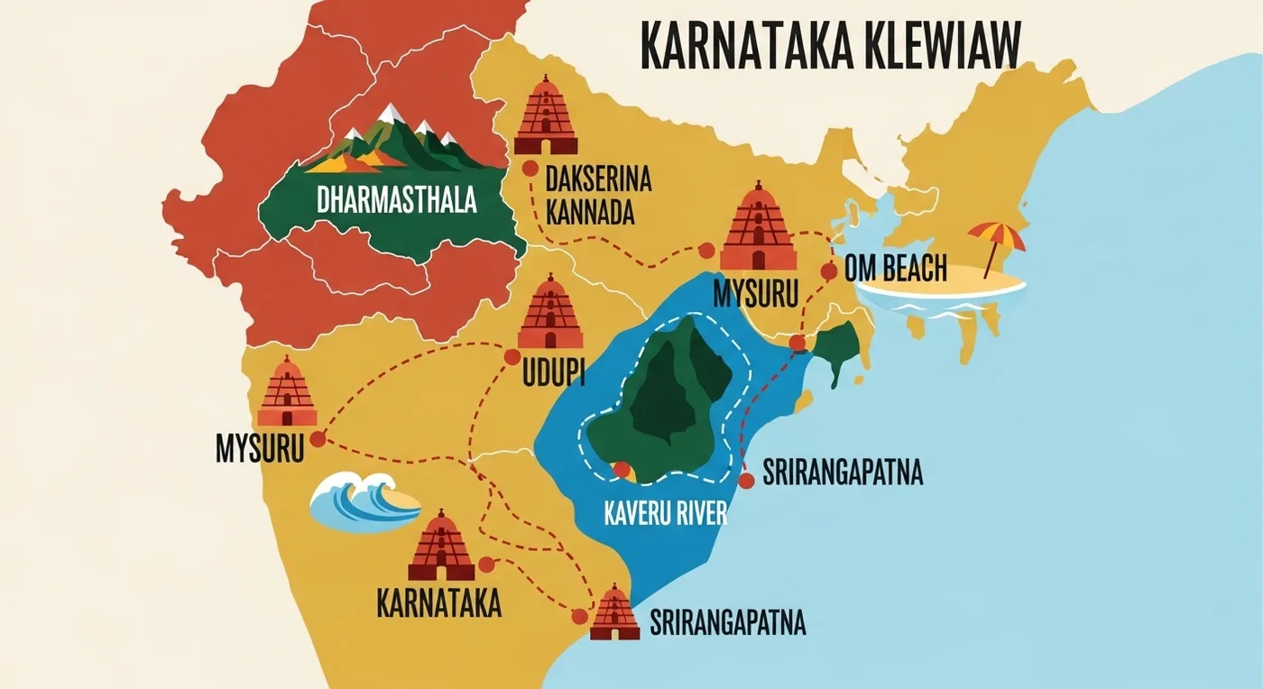 Dharmasthala has temple-run guest houses and basic town hotels. Chamundi Hills has no hilltop accommodation — stay in Mysuru (hotels from ₹1,500 – ₹8,000 per night). Udupi has mid-range hotels and matha guest houses. Srirangapatna families stay in Mysuru. Gokarna offers beach resorts from budget to boutique.