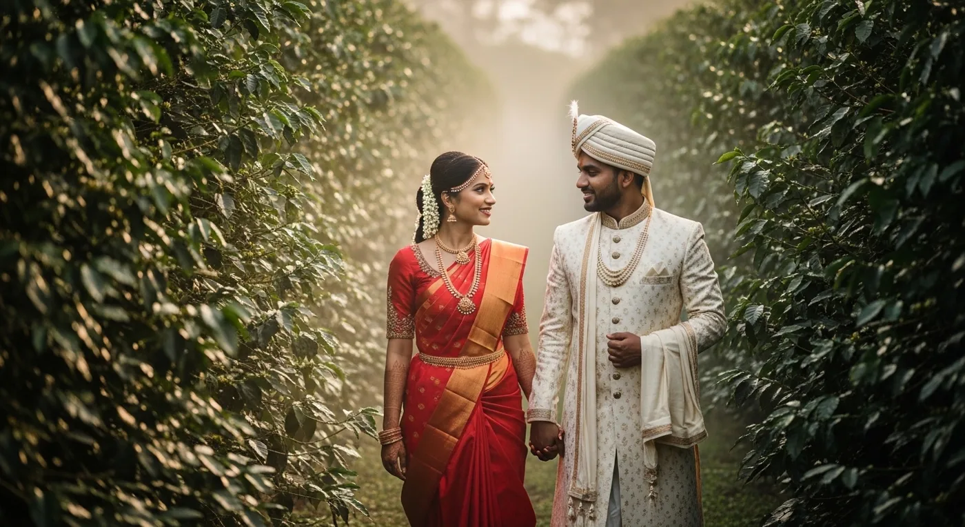 A Karnataka silk saree in warm tones — gold, maroon, deep red, or forest green — photographs well against coffee plantation greens. For the groom, a matching silk kurta or a classic white mundu with a contrasting border pairs nicely. These outfits work especially well at Namdroling Monastery, Talacauvery, and Omkareshwara Temple, where the setting has cultural weight. For a deep dive into bridal attire options with South Indian silks, check our Kodava wedding traditions guide.