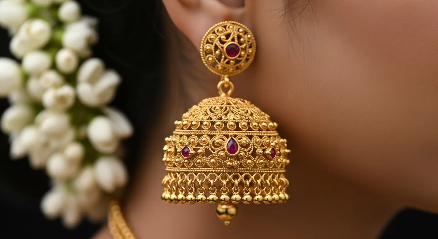 The iconic Jimikki Kammal — bell-shaped gold earrings that sway with every movement and catch the light beautifully. These Kerala-origin earrings have become a pan-Indian bridal favourite, ranging from ₹30,000 to ₹1.5 lakhs depending on weight.