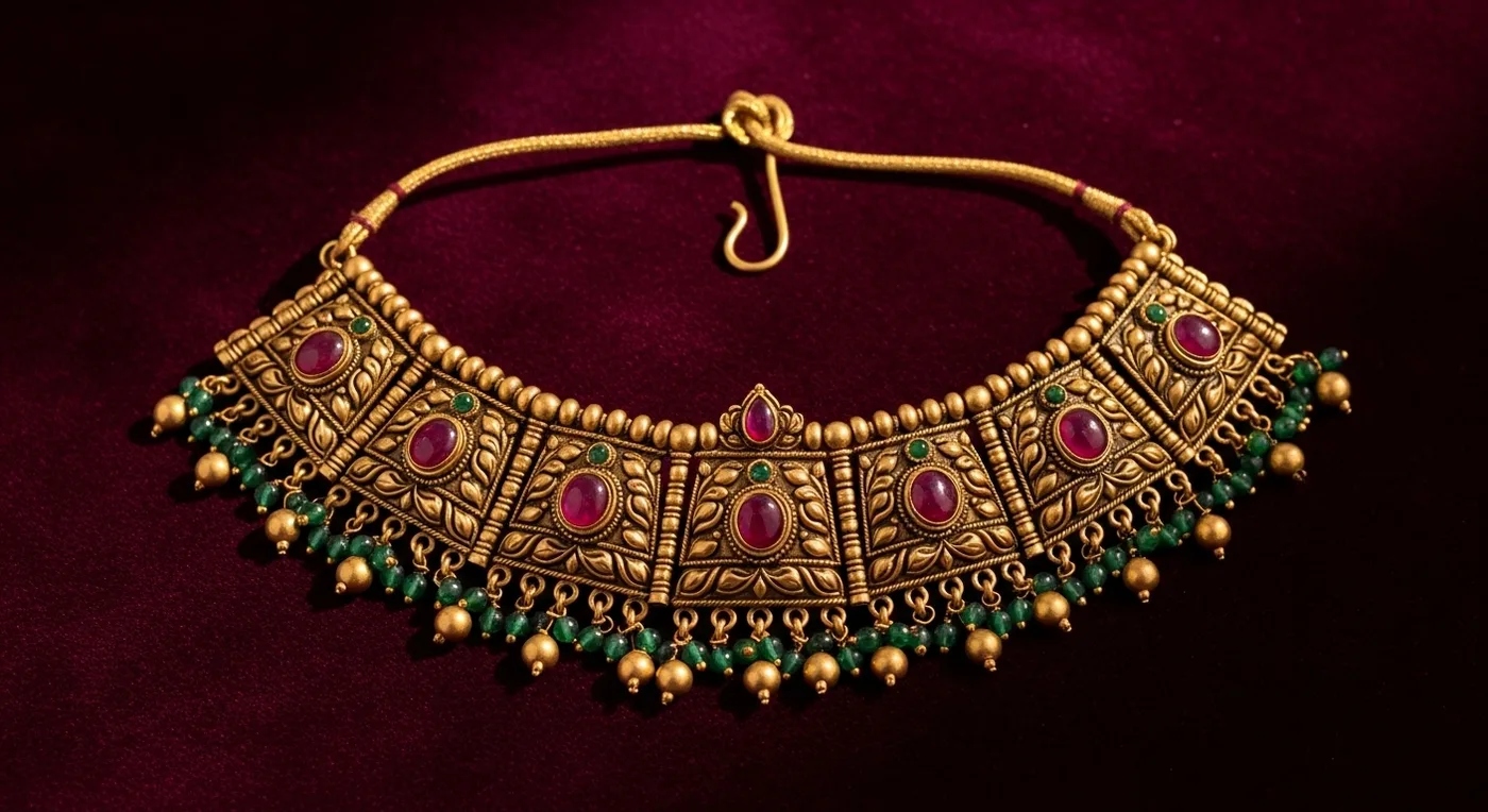 An antique-finish gold choker studded with Burmese rubies — the choker sits close to the collarbone, framing the neckline perfectly under a silk saree. Antique-finish pieces are trending for their vintage warmth and handcrafted appeal.