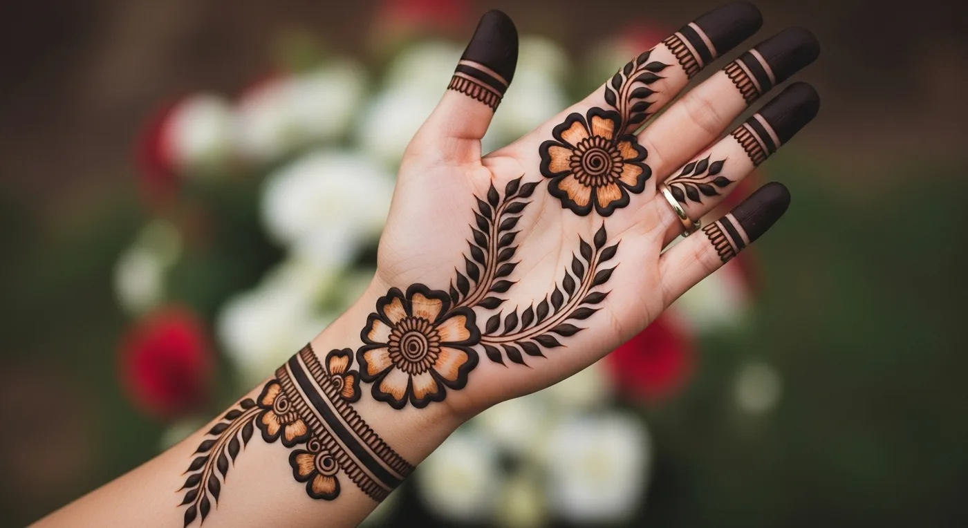 Contemporary floral vines with realistic roses — a trending fusion style that blends Western botanical illustration with traditional henna techniques. Looks especially striking against pastel bridal outfits.