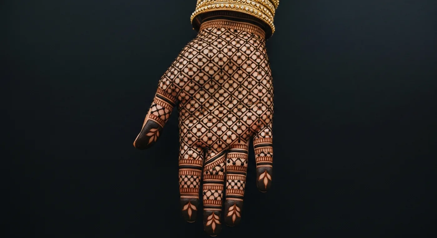 Geometric mehndi for the contemporary bride — clean lines, chevrons, and symmetrical grids replace traditional florals. This modern style pairs beautifully with minimalist jewellery and contemporary bridal outfits, and typically costs ₹5,000-₹10,000.