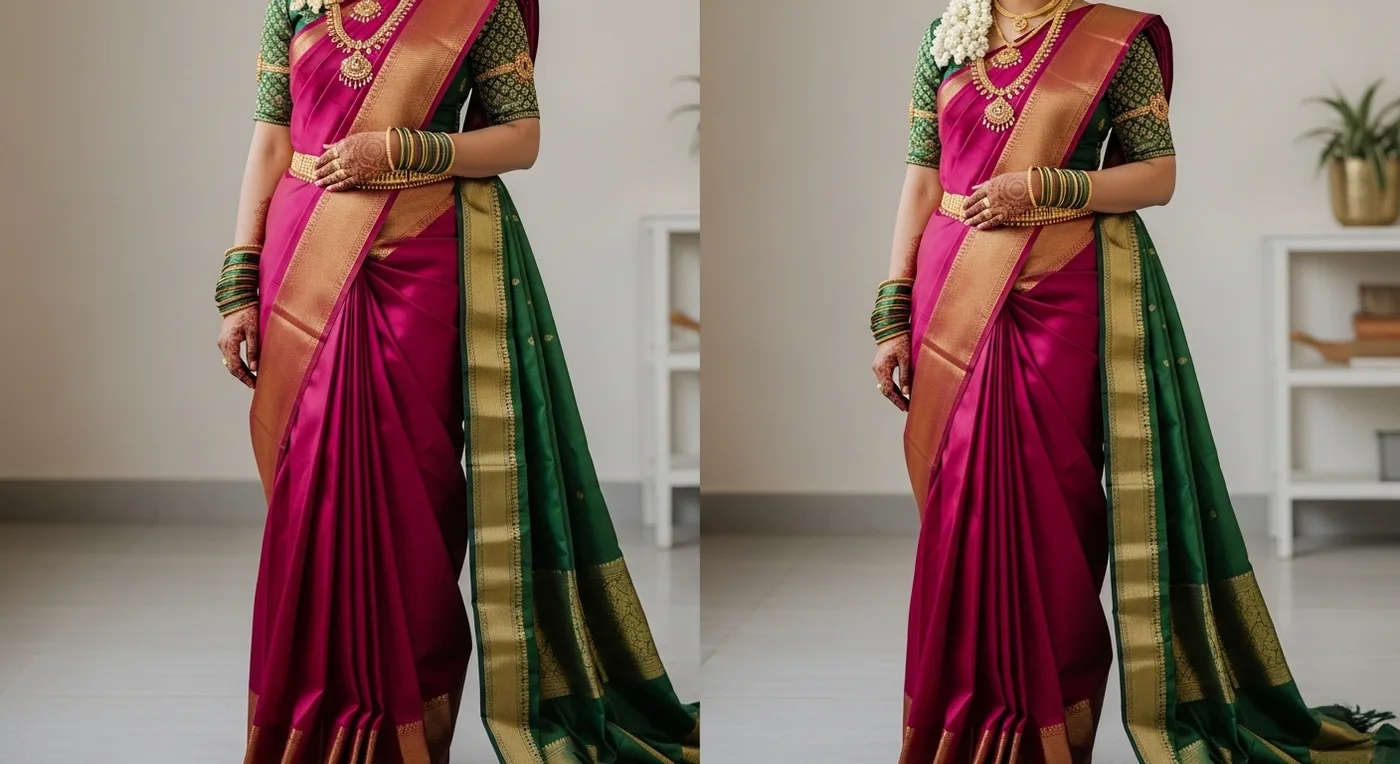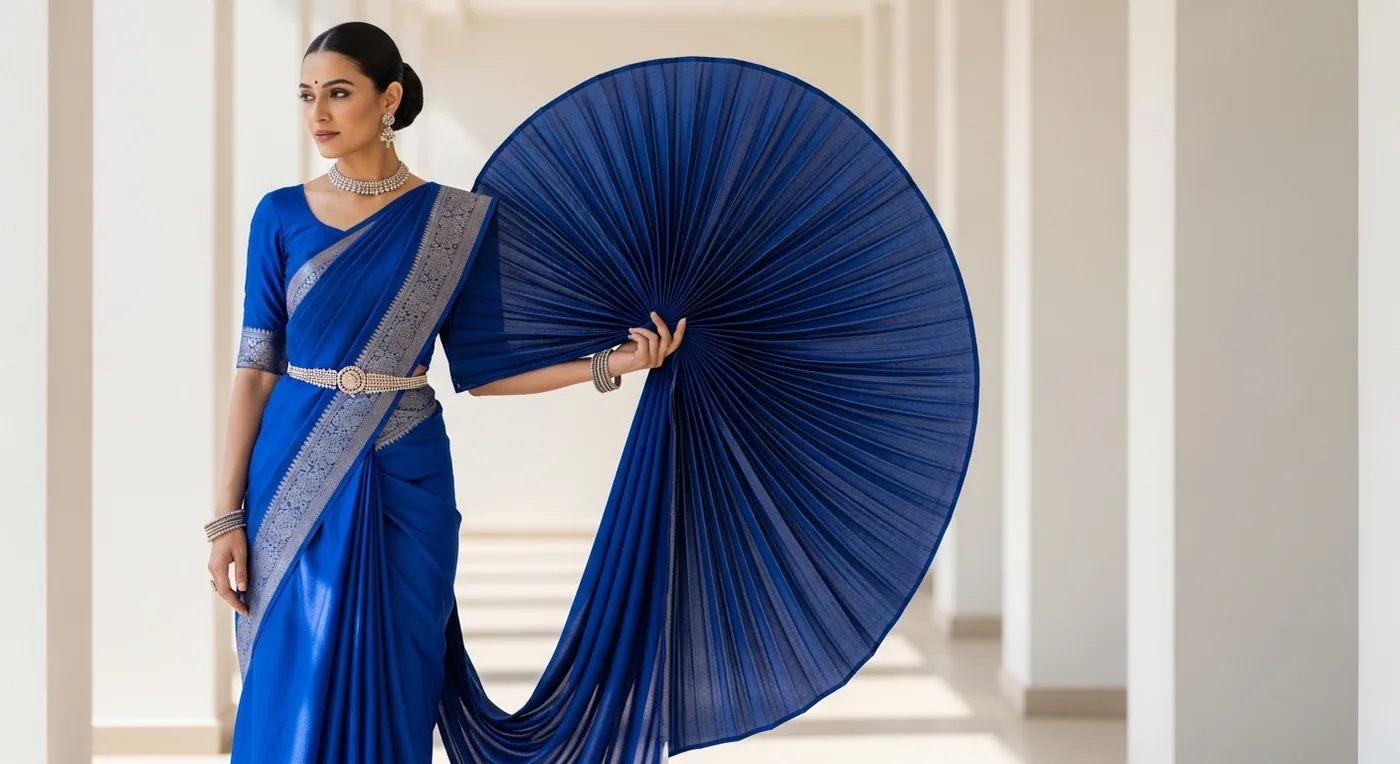 The classic Nivi drape on a Kanchipuram silk — India's most popular saree draping style, with neat front pleats tucked into the waist and the pallu draped diagonally over the shoulder. The structured pleats showcase the saree's rich border and motifs beautifully.