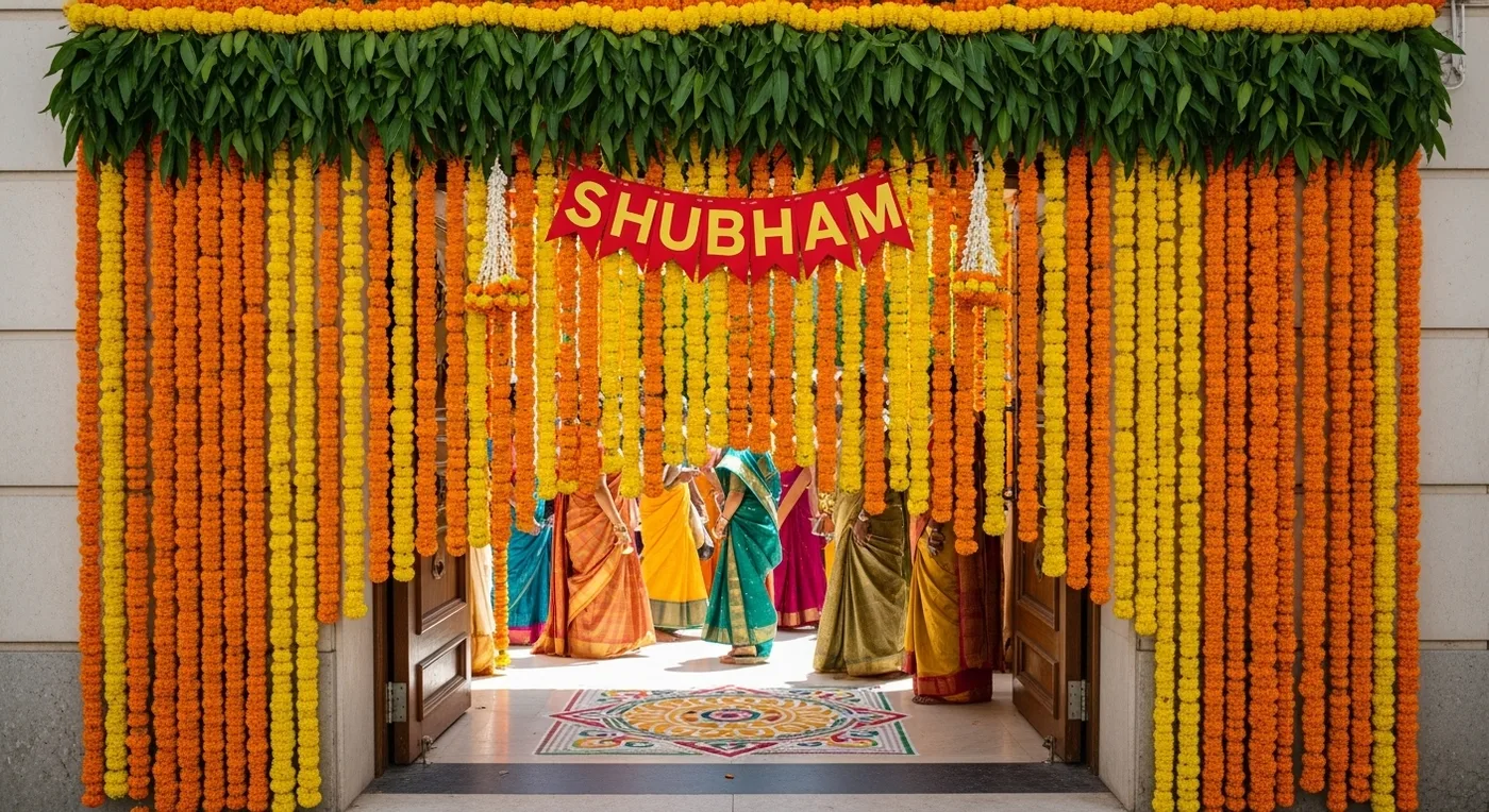 A marigold-draped hall entrance — dense garlands in turmeric yellow and orange welcome guests with colour and fragrance. Marigolds are considered auspicious in Telugu culture, and decorators use hundreds of kilos for large weddings.